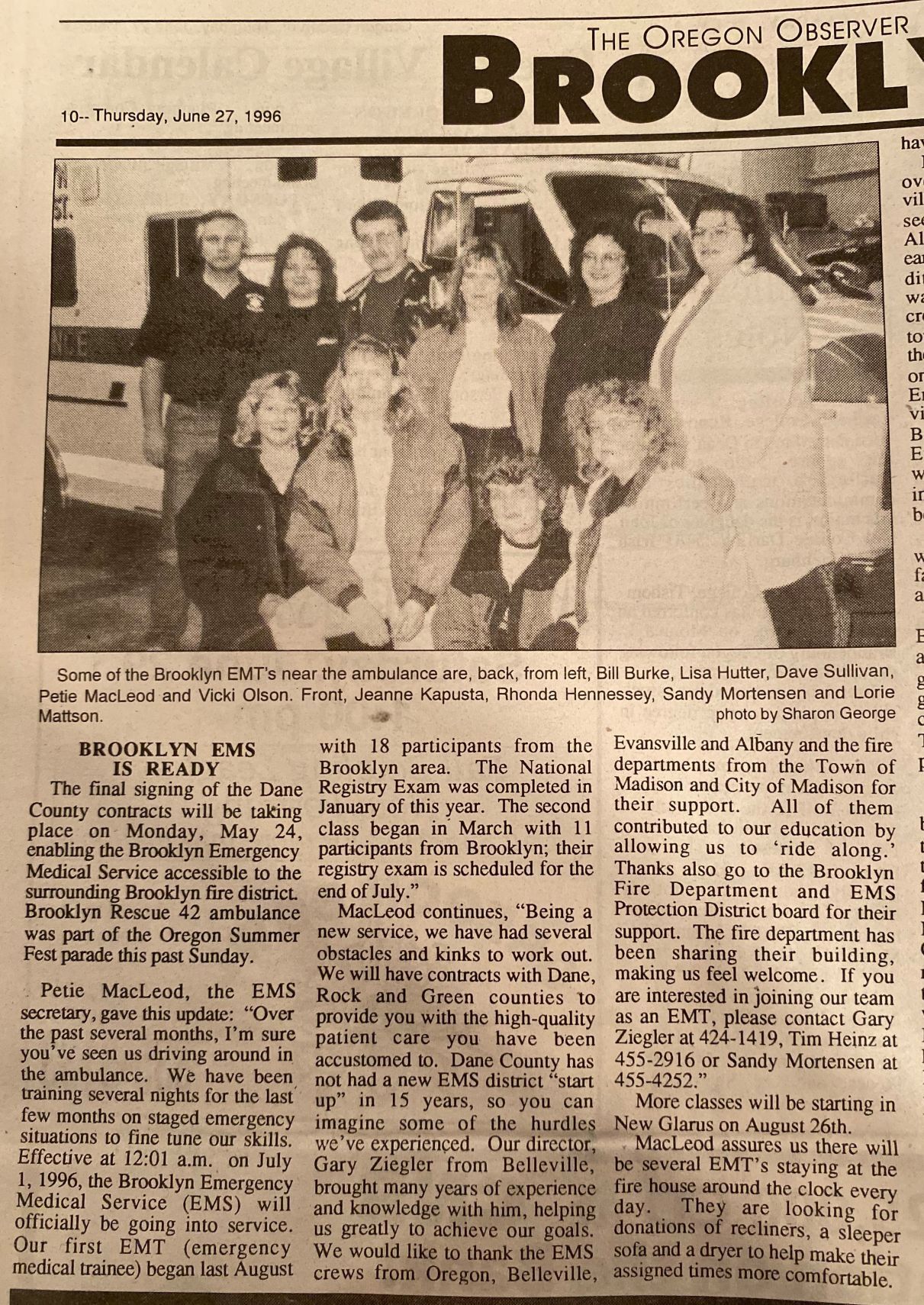 Prior to the formation of Brooklyn EMS, services were provided by surrounding communities including Oregon, Evansville, Belleville, Stoughton and Albany, former director Evelyn Hall told the Observer.
